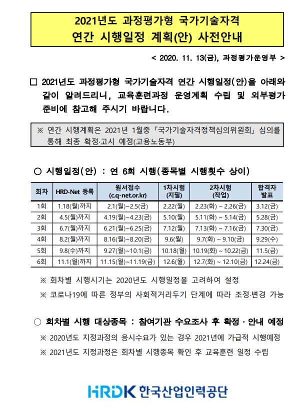 21년 과정평가형 국가기술 연간 시행일정 계획 사전안내