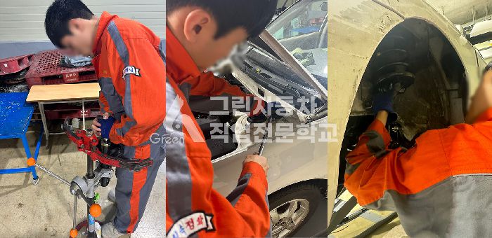 [작업내용] : 쇼크업소버 교환 [소모품 및 필요공구] : 쇼크업소버 4EA, 스프링 탈착기, 12mm 소켓, 14mm 소켓, 17mm 소켓, 연결대, 라쳇렌치, 힌지핸들 [작업 전 상태] : 쇼크업소버 불량으로 인한 승차감 저하 [작업 후 상태] : 쇼크업소버 교체 후 승차감 향상 [훈련생 소감] : 평소 아버지가 타고 다니시던 자동차인데 한 번 몰게 되어 타봤는데 쇼크업소버가 수명이 다 된 느낌이었다. 요철이나 맨홀 뚜껑을 지날 때 승차감이 좋지 않았다. 아버지의 허리 건강이 걱정되어 쇼크업소버를 교체하려던 차에 학교의 자가정비 프로그램을 통해 실습을 복습하는 차원에서 하게 되었다. 선생님 지도하에 수행했던 실습이 많이 도움 되었고 학생들의 도움으로 시간은 오래 걸렸지만 정확하고 안전하게 교체할 수 있었다. 무엇보다 나중에 취업을 나가 실차를 정비 해야하는데 미리 해볼 수 있어 많은 경험이 되었다.