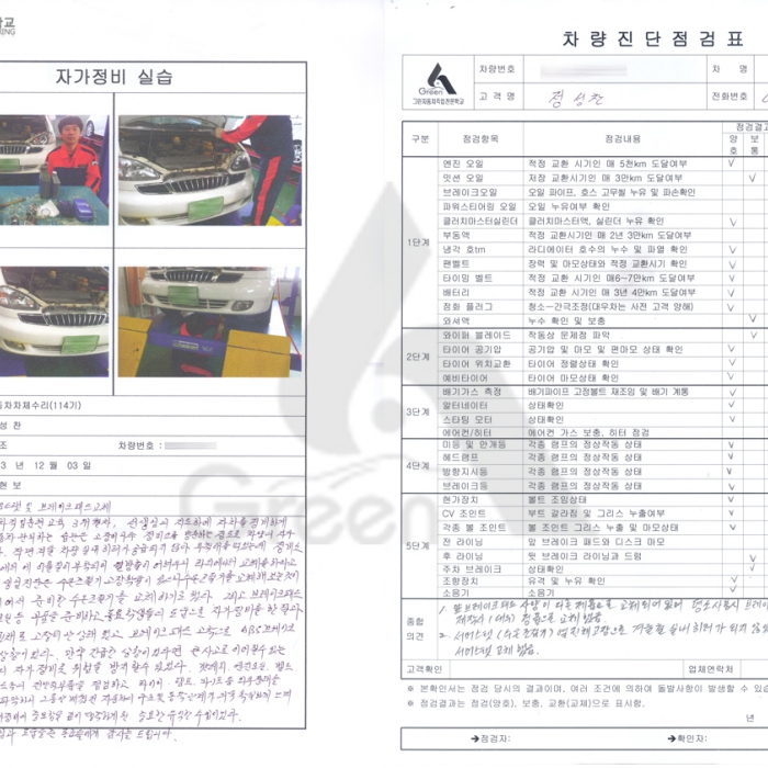 외부 상태를 점검하고 상태를 파악하니 그동안 배웠던 자동차의 구조 및 동작관계가 더욱 확실하게 느껴졌다. 더불어 자가정비의 중요함을 깊이 생각하게된 중요한