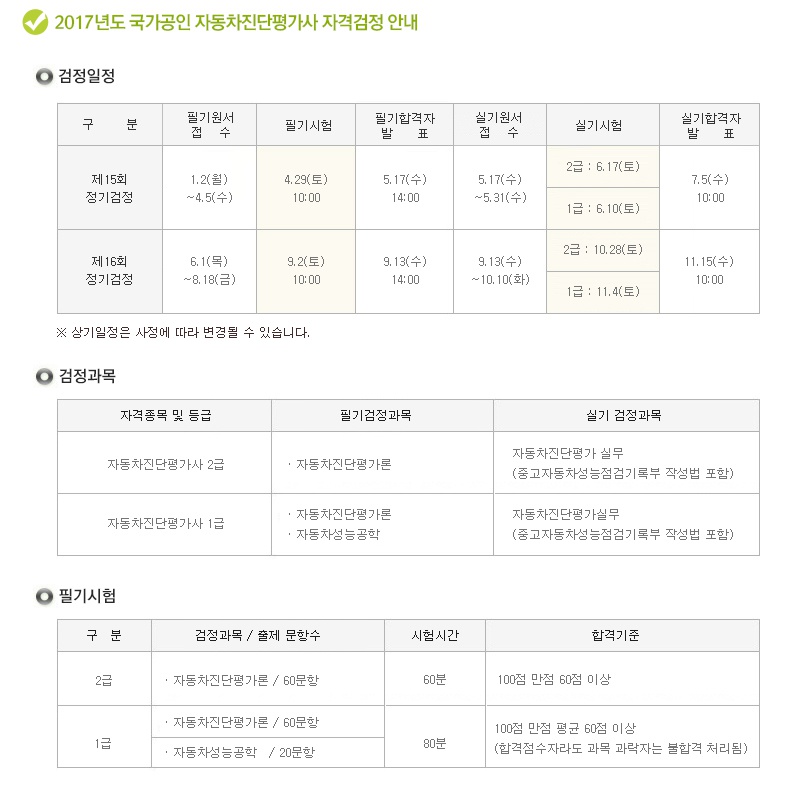 3. 자동차진단평가사 17년 시험일정은 아래와 같으며, 자세한 정보는 (사)한국자동차진단보증협회(www.kaiwa.org) 홈페이지를 이용하여 접수 바랍니다. 감사합니다.