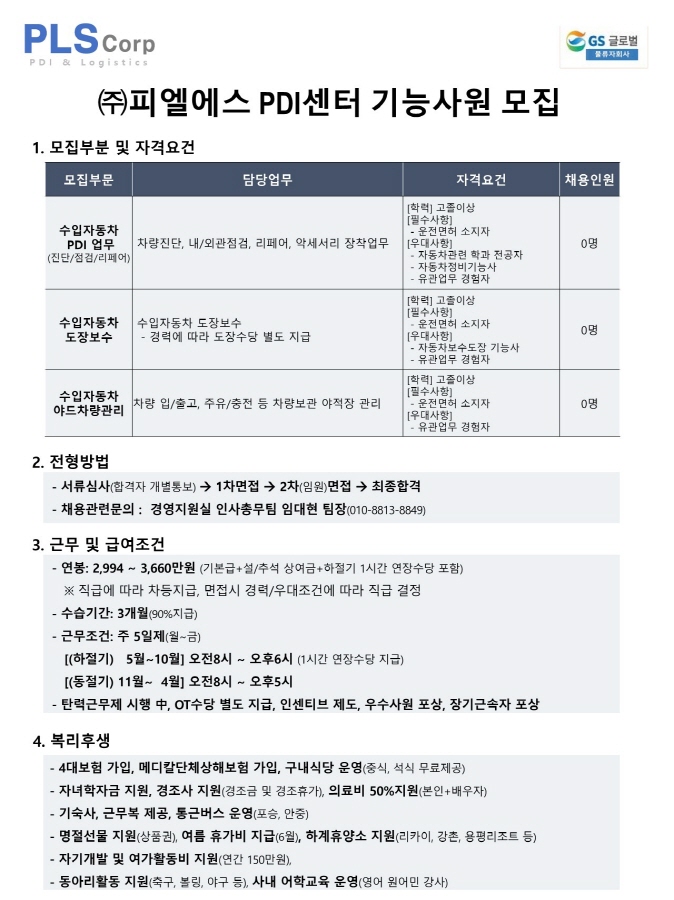 하기와 같이 PLS 기능사원 모집하오니 많은 지원 부탁드립니다.