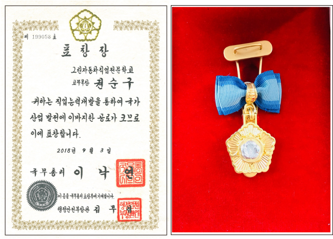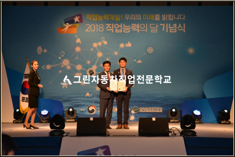 촉진시키기 위해 1997년부터 시작되었습니다. 직업훈련기관 및 직업훈련기관대표, 직업훈련교원, 등 다양한 분야의 직업능력 개발관련 유공자와 명장·숙련기술 전승을 포상하였는데 우리 그린자동차직업전문학교 권순구 부장님께서 국무총리상을 수상 하셨답니다~!!!!