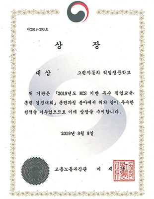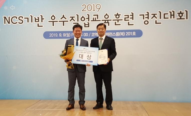 2019년 NCS기반 우수직업교육훈련 경진대회 <훈련과정 분야> 대상 영예. 고용노동부장관상수상